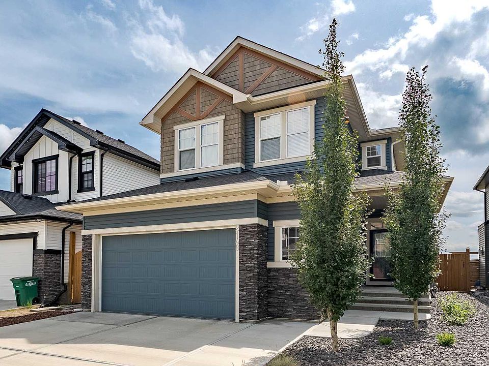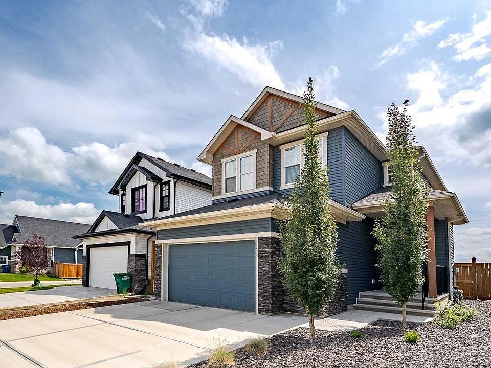 Your dream home awaits in this stunning 3-bedroom, 2-storey located in the desirable community Ravenswood. From the moment you step into the spacious front foyer, you'll notice the quality of this Broadview-built home. Constructed in 2018 and meticulously maintained, it still shows like new, truly a 10/10! Wide plank engineered hardwood guide you through the open concept main level, where you will discover the heart of the home; a beautiful kitchen, designed for both everyday living and entertaining. Featuring an island with seating for 5, quartz counter tops, rich dark maple cabinetry, and classic white subway tile backsplash. Equipped with a five-burner gas range, stainless steel KitchenAid appliances, a built-in microwave, and a convenient walkthrough pantry. The main floor boasts 9-foot ceilings and a stunning vaulted living room filled with natural light, thanks to the large windows that frame the cozy gas fireplace. Sliding glass doors open to the back deck, ideal for indoor/outdoor entertaining, complete with a fully fenced yard and thoughtful landscaping. The mudroom/laundry room connects the main floor to the oversized 24x24 double attached garage and this floor wouldn't be complete without a 2-piece powder room. Upstairs, you will find a spacious bonus room, 3 generously sized bedrooms, including a serene primary suite with a walk-in closet and luxurious 5-piece ensuite. A 4-piece bath also serves the additional bedrooms on this floor. The stairs to the basement are already finished, and the remainder is ready for your creative vision. This home has it all with room to grow! Ravenswood offers excellent walkability, convenient access to shopping and amenities, and easy access to highway 2, just a short 20-minute drive to Calgary. This home is ready to welcome you!