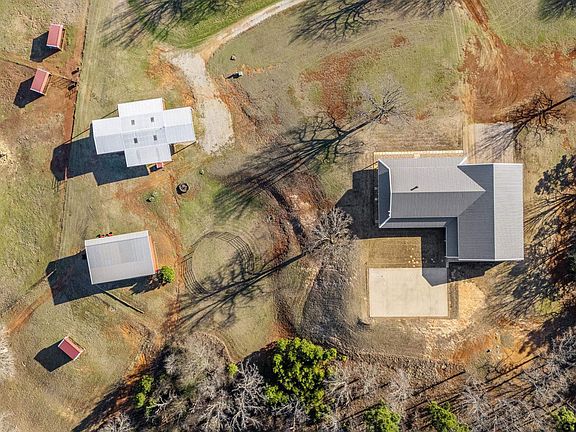 Welcome to your Texas dream retreat—over 53 acres of rolling hills, dense trees, and wide-open pastures, all centered around a stunning one-story Barndominium designed for comfort and style. Please note: the exterior of the home is red, but the owners will offer a PAINT BUDGET with a successful contract. Built to the highest standards, this home offers spray foam insulation, Bryant multi-speed HVAC systems with remote access, and upgraded electrical for year-round efficiency and safety. The open, light-filled floor plan features a spacious main living area, large windows framing the countryside, and a secondary living space with its own kitchen—perfect for multi-generational living or hosting guests. Additional bedrooms and two full baths provide ample space, while a wraparound porch with ceiling fans is ideal for enjoying Texas sunsets. Outside, enjoy a six-car covered carport that doubles as a party space, a concrete pad ready for pickleball, a fully equipped shop with dedicated power, bathroom, and RV hookups, and an expanded storage barn with new lighting. Horse enthusiasts will love the three fenced pastures, arena, tack room, hay barn, and three run-in stalls. A working well serves the property and can be redirected to the home, and modern touches like Starlink internet, surround sound, and security cameras keep you connected and secure. Bonus: all furniture and accessories are negotiable with the sale, making this property truly move-in ready