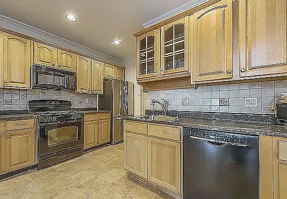 Recessed lightingFormal dining roomLots of cabinetsCeiling fanGlass backsplash