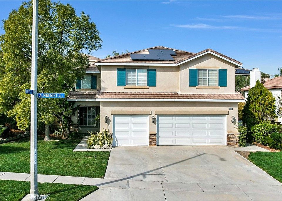 Welcome to this exquisite 2-story residence that features 5 bedrooms, 3 bathrooms and a FULLY PAID OFF SOLAR and LOW TAXES, Upon entering, you are greeted by a spacious formal living room, seamlessly opening into the dining room, creating an inviting atmosphere for both entertaining and intimate gatherings. The home features 3-car garage and offers a well-planned layout. Conveniently situated on the first floor is one of the bedrooms, nestled next to a full bathroom, ideal for guests or as a versatile home office. The heart of this home is its kitchen, boasting a center island and an open design that flows effortlessly into the family room. large loft area offers additional living space, perfect for a variety of uses. This level also houses 4 generously sized bedrooms and 2 bathrooms, ensuring comfort and privacy for family members and guests. The backyard is private and unique featuring a large patio cover for shaded outdoor dining or relaxation, a cozy fire pit area for memorable evenings, and a multilevel water fountain that adds an element of tranquility and sophistication. This home's prime location near shopping centers, Costco, Walmart and convenient freeway access for an easier commute to OC, LA and surrounding areas.
