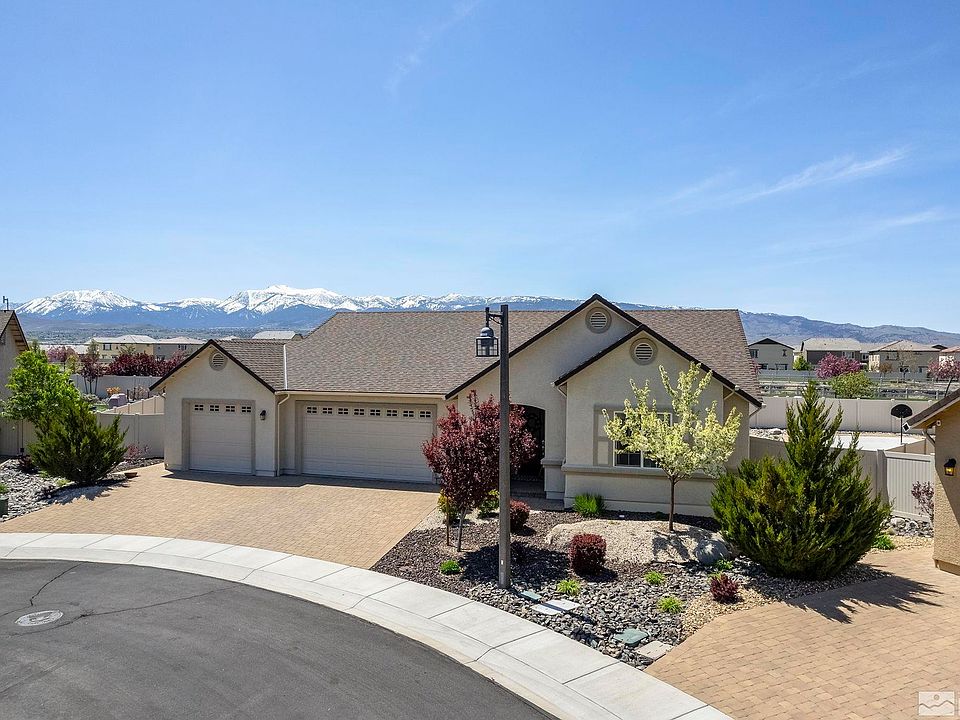 Great home in the highly desired La Casata community of Damonte Ranch. Stunning views of Mt Rose in the back and from the front great views of the Virginia Mountain Range. At the very end of large cul-de-sac with a large back yard including large side yards giving you lots of privacy., This beautiful home has lots of natural light featuring 3 bedrooms,2 bathrooms,3 car garage. Nice open floor plan with a L-shaped large granite breakfast bar, walk-in pantry. Built-in’s in the great room and guest bedroom.Large walk-in closet in primary bedroom. Luxury vinyl plank floors throughout with title in bathrooms and laundry room. Tankless on demand water heater. Lots of storage in garage with a drop down ladder in to attic. Backyard with covered paver patio, paver walkways to each side yard. North side has a great space for Basketball with a large concrete area. South side has a professionally installed playground. With xeriscape yard nicely done with rock design.