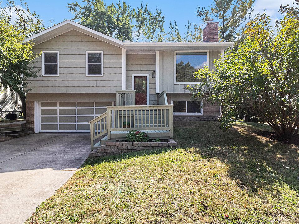 Brick fireplaceAttached garageSunny raised ranchFront porchCorner lotPaver walkwayEnsuite primary bedroom