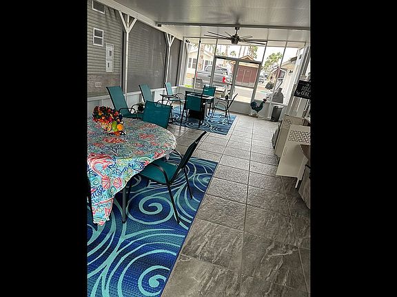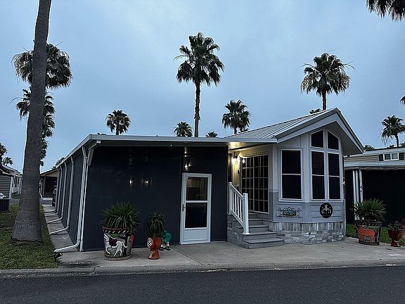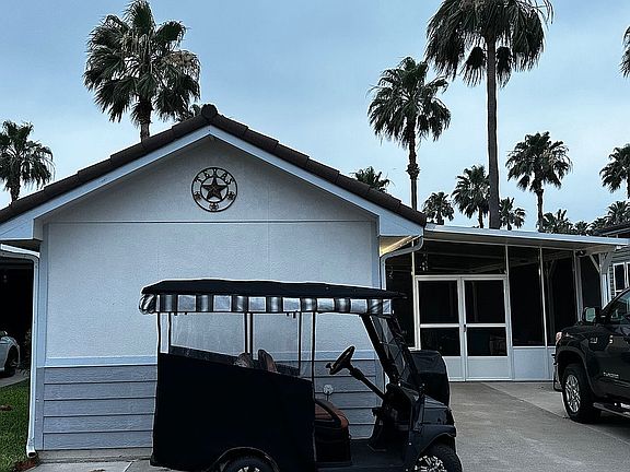 You own the land in this section of the park. This beautiful furnished home includes an expensive sleeper sectional with a Tempur-Pedic mattress, accent chairs, TV. Bedroom has a TV, a new Queen size bed with under storage and a large closet. The many windows which give a lot of light in the home. The kitchen has a full size refrigerator, gas range with plenty of cupboard space. High chisel peak ceiling with overhead shelving displaying large pottery vases (included). The walls are earth tone colors with laminate/tile flooring. New HVAC system for cooling and electric heating. Plus an additional gas furnace (separate thermostat) to use optionally if desired for unusual winter cold spells. Nest thermostat to control HVC remotely. Blink camera system has 6 outdoor and 2 indoor motion activated cameras controlled remotely. Beautiful and sturdy new metal roof. Comes with a Whirlpool water softener and reverse osmosis drinking water system. Property sits on an oversized concrete pad. Cement board siding with brick skirting and metal roof installed in 2023. The 15’ x 28’ screened-in Texas Room area has plenty of room for entertaining & includes a TV and patio furniture (including a 60 round table with folding chairs, gas fire pit table, rocket and cabinets. Black Stone Grill & a Traeger smoker are included for a great BBQ. The 13’ x 12’ shed has plenty of room for storage. The laundry room has a new washer/dryer & a full bath/walk-in shower and a mini split air and heat. The 2020 electric golf cart also available for sale. Close to all of the amenities the park has to offer, including a golf course is nearby for the avid golfer. Make this cute “move in condition” home your winter home !