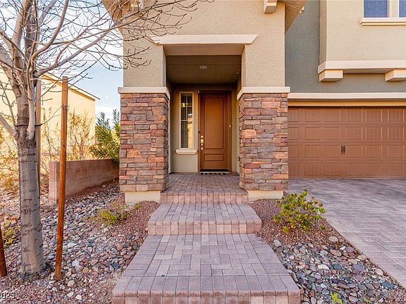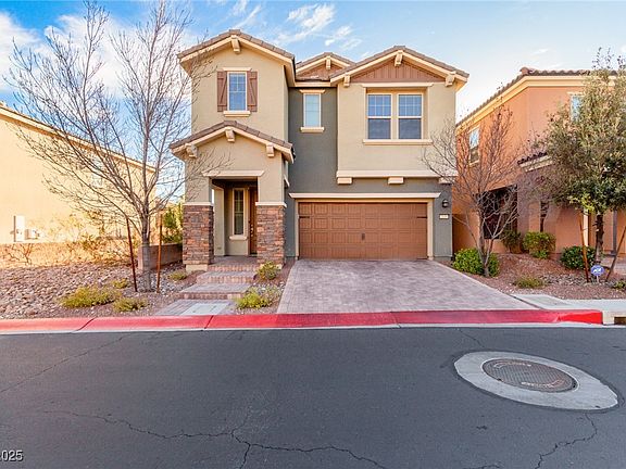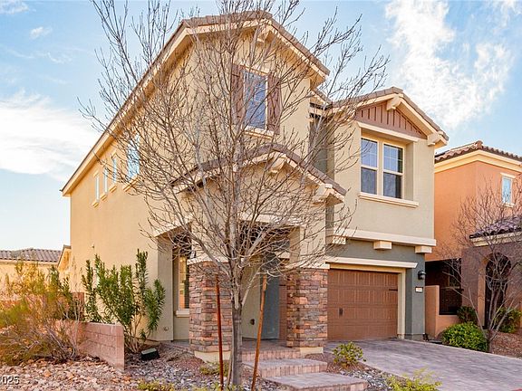 Discover this beautiful move-in ready home in Summerlin! This 3-bedroom residence showcases a 2-car garage, a tasteful paver driveway, and eye-catching stone accents. Inside, you'll be delighted by the captivating open layout with high ceilings, a soothing palette, blinds, and warm wood flooring. The gourmet kitchen is equipped with granite counters, wood shaker cabinetry with crown molding, recessed lighting, stainless steel appliances, a handy pantry, and an island with a breakfast bar. Upstairs, you'll find a versatile loft perfect for an office or an entertainment room. The serene main bedroom showcases plush carpeting, an ensuite with double vanities, and a convenient walk-in closet. Enchanting moments await in the cozy backyard, complete with a covered patio and a fully heated, crystal-clear spa, ready for you to open the lid and enjoy a relaxing soak! Conveniently close to shopping destinations, delectable restaurants, and entertainment. Make this gem yours!