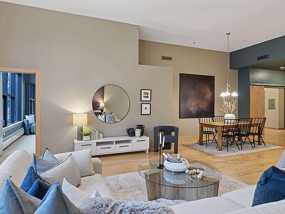 This completely unique 2 bedroom home in the heart of the Mill District is now for sale. This first floor home is the only one of its floor plan in the highly desirable Bridgewater Lofts. The cozy condo has dramatically soaring ceilings, accentuated by the oversized windows that provide an uninterrupted eye level view of Gold Medal Park. The spacious living area is open and airy, and opens to the kitchen and dining area. Cooking enthusiasts will love the GE Profile appliances, and entertainers will adore the spacious center island with its built-in wine fridge. The owner's suite matches the dramatic views, with built-in roller shades for privacy, a cozy nook ideal for curling up with a book, a walk-in closet with custom built-ins, and a spa-like bath with luxuries such as a dual vanity, walk-in shower, and soaking tub. Both owner's and 2nd bedroom have new 100% wool berber carpeting, and the entire condo has been painted by the owners. The 2nd bedroom, with its stylish sliding barn doors, is ideal for use as a guest bedroom, media room, or office. The condo includes a convenient laundry closet located in the hall and 2 assigned parking stalls.