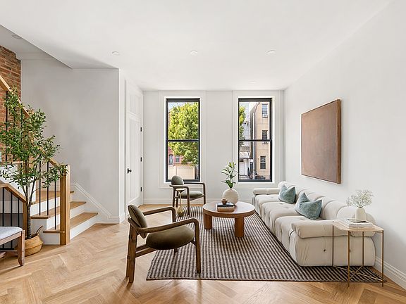The parlor level welcomes you with a sun-filled, open-concept living and dining area. Herringbone wood floors, tall ceilings, and oversized windows create a warm, elevated feel.