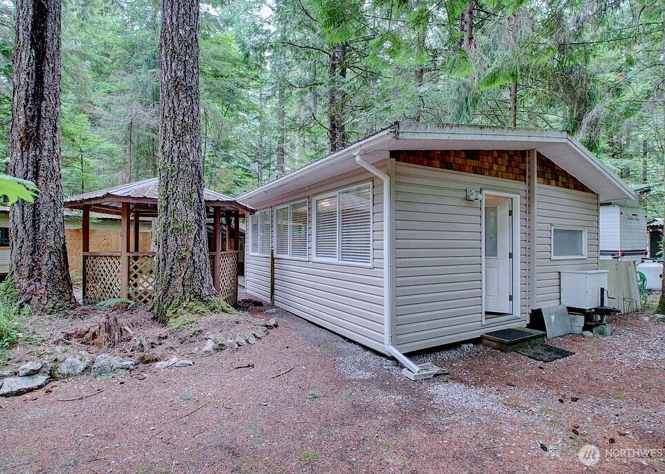 Large 4,356 sf corner lot at the desirable far end of quiet div 3. 2004 travel trailer with metal roof and beautifully done add a room for additional finished space. Trailer has two separate bedroom areas and also additional sleeping space. Insulated shed can be used for extra storage and/or a flex space. Open air gazebo and covered deck are perfect for relaxing and enjoying the Glen outdoors in any weather. across from short cut trail to the best river access at the Glen. The Glen is zoned recreational for 120 days of use out of the year and has all the amenities you could want, including 2 pools, hot tub, pickleball courts, library, laundry mat, 2 clubhouse, 24 hr security, gated entry, & play areas.