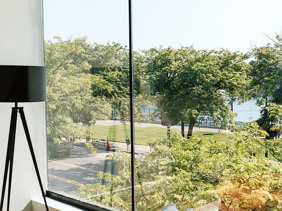 Open Living Area: A stylish and comfortable living space with floor-to-ceiling windows showcasing panoramic lake views. Off the main living space find yourself relaxing on your own private balcony overlooking the ferry boat dock and the famous Charlevoix Memorial Drawbridge.