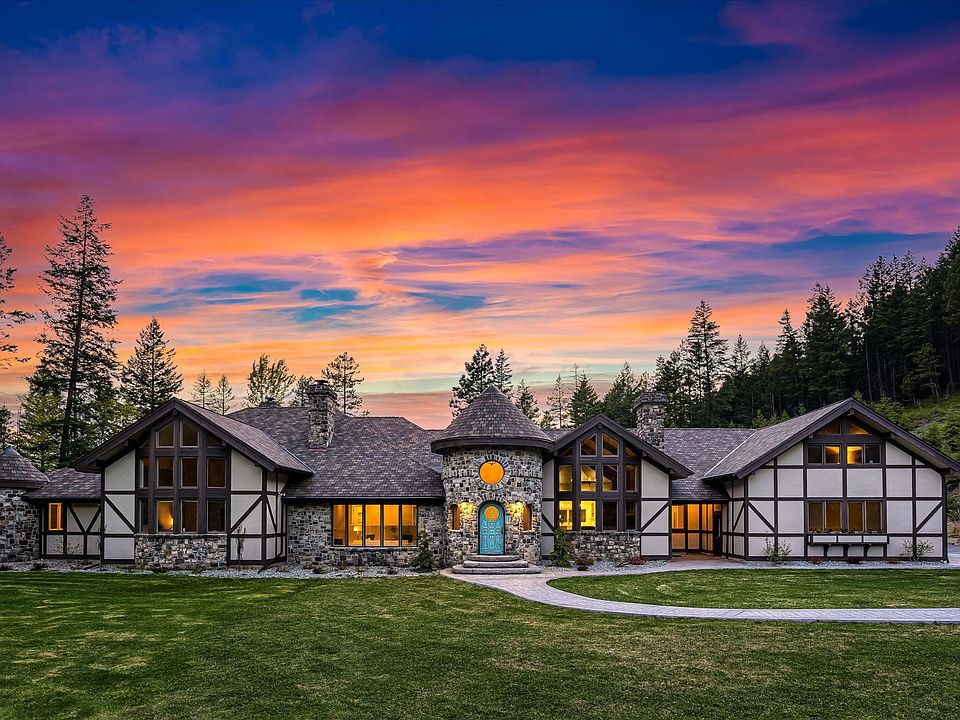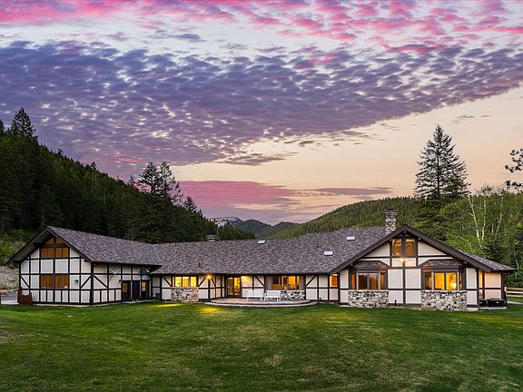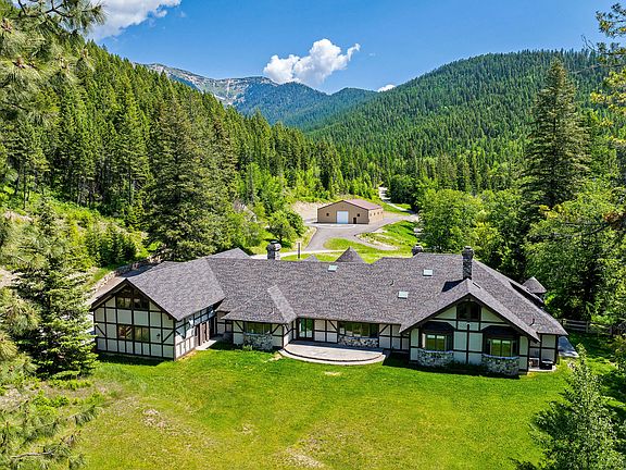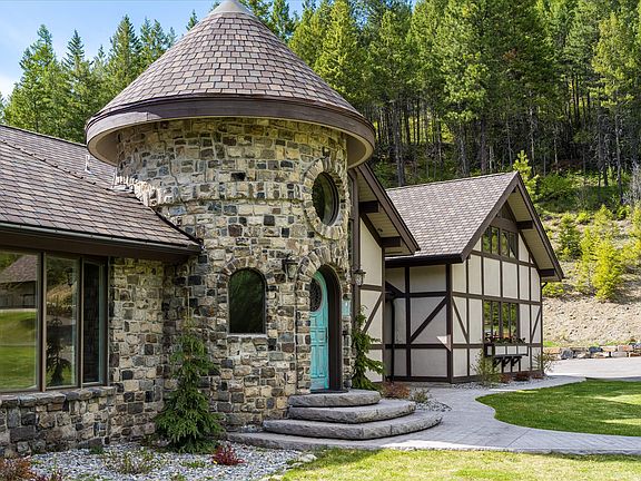 Storybook European-Style Estate on 21+ Acres with a 2-bedroom Guesthouse & 60' x 80' Shop. Step into a fairytale with this enchanting European-inspired estate, nestled on 21.32 private acres at the base of the Swan Mountain Range. Enjoy lush forest & the gentle sounds of Brown Creek, the scenic drive opens to captivating valley views & timeless Tudor-style architecture. Stone accents & expansive windows define the home’s exterior, while the interior is bathed in natural light & filled with old-world charm. A grand turret entry introduces the formal living & dining rooms, ideal for entertaining or peaceful retreat. The primary suite is a private sanctuary with vaulted ceilings & a spa-like ensuite featuring a one-of-a-kind shower in the home’s second turret. Additional features include a spacious kitchen, warm family room with vaulted ceiling, living room, cozy library, exercise room, a spacious 4 stall garage & large, landscaped area for recreational activities. Guests will enjoy the private guesthouse, and hobbyists or collectors will appreciate the spacious 80'x60' shop. This is a truly special Montana property—offering privacy, beauty, and a lifestyle to be cherished for generations