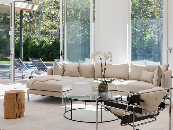 Just listed, brand new and first time rental. Striking,well located modern home featuring six bedrooms, six and one half baths and three levels of living space. This 5,400sf home is very open plan with wide open spaces, sliders throughout and with great light due to a southerly exposure. There is a not to be missed gourmet kitchen with a large island, wet bar and high-end appliances. On the main floor there is the convenience of a junior master suite/den with an en-suite bath. Upstairs there is a master suite at one end of the house with a spacious spa-like bath with its own outdoor shower, and two generous sized walk in closets. In addition,there are three spacious bedrooms with ensuite baths and a full laundry area. There is a finished lower level featuring a bedroom with ensuite bath, large media room, gym area and wine display/storage area. In addition there is a saltwater gunite pool with spa,a large covered porch clad in mahogany and perfect for outdoor dining. The property is well landscaped and perfect place to lounge while overlooking the expansive backyard. Situated on just over an acre of cleared, lushly landscaped property creating total quiet & seclusion. Just a short drive to both ocean and bays and convenient to both East Hampton and Sag Harbor villages.