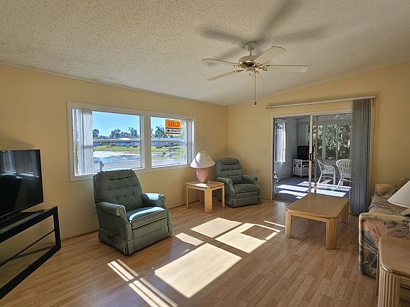 LOCATED IN BEAUTIFUL HACIENDA DEL RIO, A 55+ COMMUNITY! - This beautiful 1993 Jacobsen home boasts stunning lake views and a canal along the side. With 2 bedrooms and 2 bathrooms, it offers a comfortable and private living experience, as there are no neighbors on one side of the home, providing extra yard space. The all-season room adds an additional 208 sq ft of living space. The kitchen is thoughtfully designed for family and entertaining, featuring abundant cabinet space for all your culinary needs. A separate dining area complements the kitchen layout. The living room offers picturesque views of one of the smaller lakes, where you can observe various waterfowl and enjoy the surrounding lush, tropical nature. The primary bedroom is generously sized, easily accommodating a king-size bed and offering ample closet space. Its en-suite bathroom provides an extra layer of privacy. The guest bedroom is also well-proportioned, fitting a queen-size bed with ease and providing convenient access to the guest bathroom. An enclosed sunroom, accessible via sliding glass doors from the living room, provides versatile extra space for enjoying nature or entertaining guests. This sunroom also houses an indoor laundry room with a good-sized storage area and a rear entry door leading to the private backyard. Call today to schedule an appointment to view this impressive home with its semi-private yard space. Meet new neighbors and enjoy our active 55+ resort style living. This home is a must see, schedule an appointment to tour this home today.