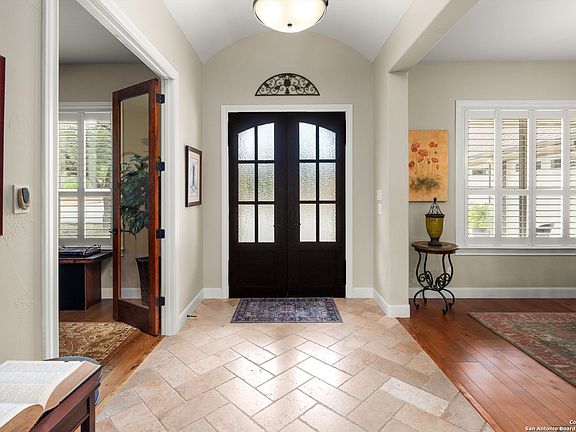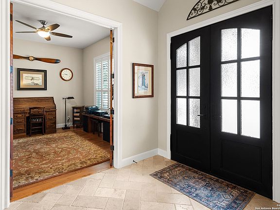Welcome to 215 Charon Point, where incredible lake views and Texas Hill Country beauty come together in the prestigious Mystic Shores subdivision! Set on a sprawling 1.69-acre lot, this single-story home offers breathtaking Canyon Lake views from the back patio and throughout the home's rear-facing windows. Inside, you'll find elegant hardwood floors, an abundance of natural light, and a spacious open-concept layout. The living room is a showstopper with a floor-to-ceiling stone fireplace and built-in shelving, while the gourmet kitchen features alder wood cabinets, built-in appliances, and a large center island with a breakfast bar. French doors lead to a quiet study with plantation shutters, perfect for a home office. The spacious primary suite captures lake views and includes a double vanity, walk-in shower, and extra cabinetry for storage. Secondary bedrooms share a Jack and Jill bathroom, and a fourth bedroom doubles as a flex room with access to the covered patio, ideal for additional living space. The well-equipped laundry room includes a utility sink, ample cabinetry with wine storage, and generous counter space. Outdoors, the covered patio invites relaxation, offering ample room for seating and dining against a backdrop of stunning lake and hill country views, shaded by large oak trees. The oversized 3-car garage (36x25) easily accommodates a Texas-sized truck and is also eager to accommodate a hobby or additional tools or toys. The stairs to the attic is a feature that should not be overlooked! This staircase provides safe access to additional storage above the large garage. Located on the north side of Canyon Lake, Mystic Shores residents enjoy exclusive lake access, including boat ramps, lakefront parks, two community pools, sports courts, community boat and RV storage, and scenic nature preserves with walking and biking trails. Don't miss your chance to make this lake-view paradise your home!