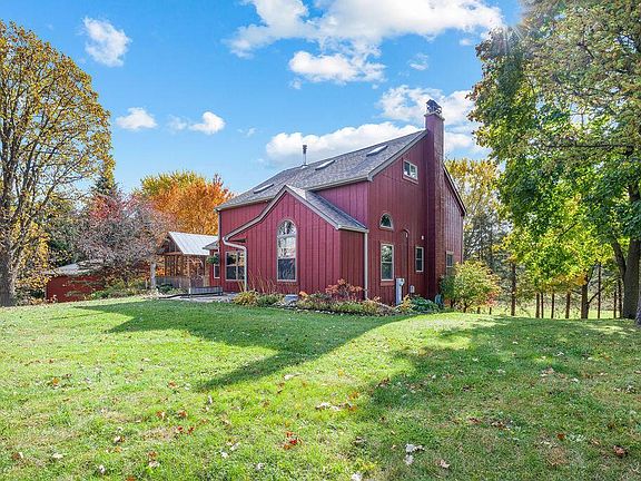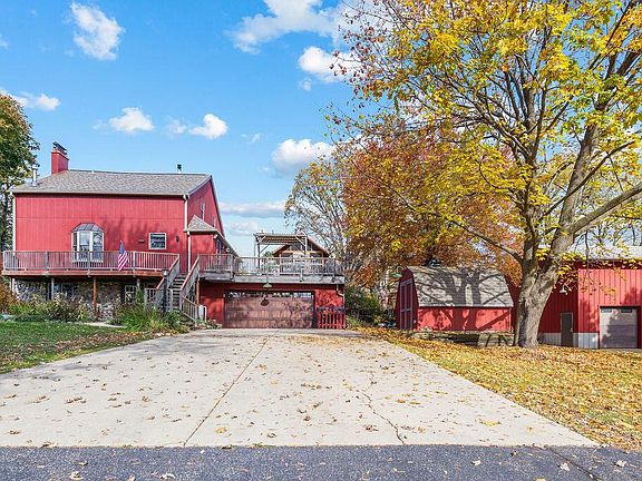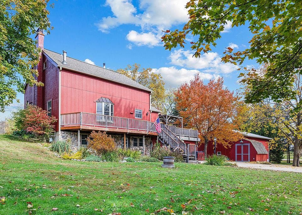 Welcome to a beautifully renovated farmhouse nestled within the original timber frame of a historic Welsh barn and set on 1.55 acres. This unique home features three comfortable bedrooms and two full bathrooms, highlighted by exposed timber framing and rich hardwood floors. Skylights overhead flood the interior with natural light, creating an airy, open atmosphere. Outside, a large patio and elevated deck provide inviting spaces for outdoor living and entertaining. For hobbyists or car enthusiasts, a spacious heated pole-barn workshop with three garage bays adds practical versatility, while two additional sheds offer even more storage or workspace. This distinctive property blends authentic historic character with modern comfort and functionality--truly a special place to call home.