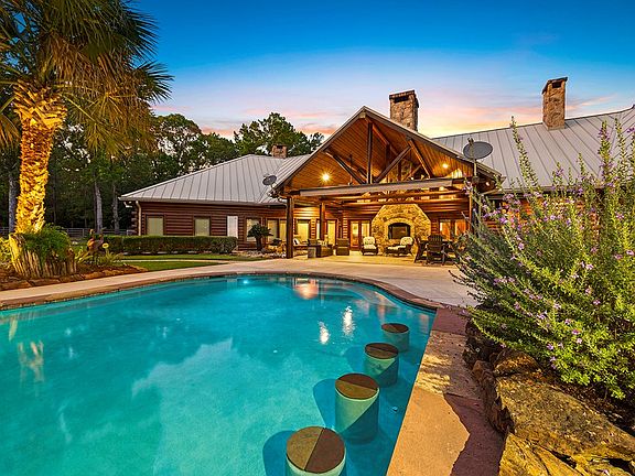 This remarkable Estate located near Lake Sam Rayburn offers the rare opportunity to own a resort within a resort a destination all its own. Featuring a 7,600 SF, 5 bedroom, 6 bath luxurious log home with a sparkling heated pool and a huge 3-car detached garage & workshop. The impressive home boasts an open, timber-framed main gathering room highlighted by a soaring stone fireplace, a gourmet kitchen w/granite counters, upscale appliances, and a dining area warmed by an adobe-style fireplace. Designed for comfort and entertaining, the home features 2 living areas, a large bar, high ceilings, a spacious master suite w/walk-out pool views, and custom finishes throughout. Additional highlights include gated entry, landscaping, ample paved parking, generator, security system, and a charming guest home. Outdoors, enjoy the covered pavilion w/fireplace & kitchen. A unique estate where rustic grandeur meets lakeside leisure, a home that is truly one of a kind. Nearby golfing, fishing &boating