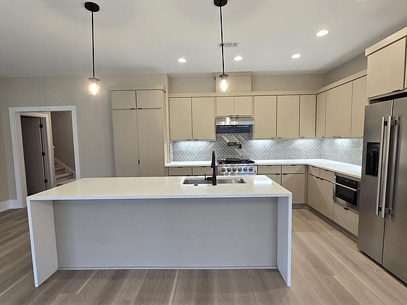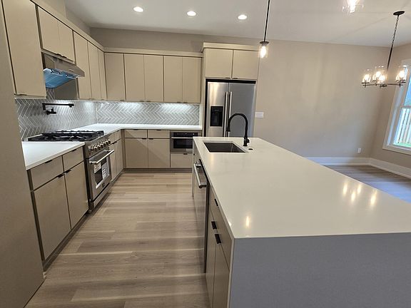 Modern craftsmanshipRanch planSleek recessed fireplaceWide trimmed baseboardsUnder cabinet lightingCeramic tile in bathroomsWaterfall kitchen island