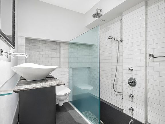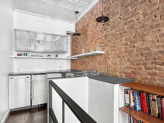 Inside, a unique and efficient layout reveals itself with a touch of whimsy and grace. The living area invites you to linger, surrounded by exposed brick walls, a wood-burning fireplace, and custom-crafted bookshelves-ready to cradle your favorite volumes and curiosities. Ornamental tin ceilings and imaginative lighting bring a golden glow, while sleek stainless steel cabinets in the kitchen offer a surprising, modern twist. One flight down the bedroom, a cozy nest, , features custom clothing closets, a built-in wrap-around desk, and space for a queen-sized bed. A cleverly stowed away washer/dryer and generous storage space surround make daily life seamless. The Japanese-inspired bath is its own private retreat, complete with a deep soaking tub, radiant heated floors, and twin rain showers-serene, spa-like, and utterly sublime.
