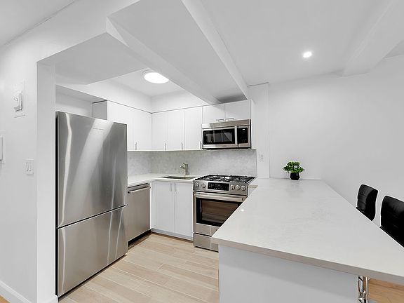 Renovated for modern luxury, the home boasts solid wood floors, a chef’s kitchen with custom cabinetry, Caesarstone quartz countertops, and Fisher & Paykel and Bosch appliances. The spa-inspired bathroom showcases Italian porcelain tile by Saime Ceramiche and a Robern mirrored cabinet. Additional highlights include recessed lighting and extra-deep closets.