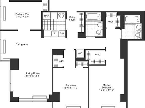 Corner 3 Bedroom, 2 Bath with a pass-through kitchen, stainless steel appliances, floor-to-ceiling windows, an in-home washer/dryer, walk-in closets, a dressing area, and southwestern exposure with views of the city.