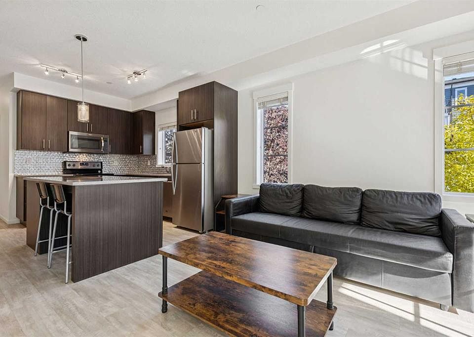 Discover condo 3211 at Legacy Gate; A fully upgraded and beautifully maintained corner unit perfectly located just steps to Legacy Pond. Here are 5 things we LOVE about this condo (and we’re sure you will too): 1. A FLOORPLAN MADE FOR REAL LIFE: This corner unit offers 672 SqFt of functional, open concept living space, 9’ ceilings, and oversized windows. The stunning kitchen opens seamlessly into the living area providing options for furniture placement to suit your needs and lifestyle while a good-sized balcony becomes an extension of your living space in the warmer months and is equipped with a BBQ gas line. The primary bedroom boasts a walkthrough closet and a designer 3-piece ensuite while the second bedroom/flex space is perfect as a home office or guest retreat with adjacent 4-piece bathroom. Convenient underground titled parking and an assigned storage locker are included. 2. THAT KITCHEN: The kitchen is truly the heart of this home and it’s easy to see why! Featuring full-height cabinetry, stainless steel appliance package, quartz counters and oversize island with seating for four, whether you’re preparing a feast or simply warming up leftovers you will feel right at home here. 3. A CONTEMPORARY NEIGHBOURHOOD: Legacy is a stunningly master planned community located in Southeast Calgary featuring a variety of housing styles to fit every budget and lifestyle. Residents enjoy 300+ acres of protected space, parks, 6 state-of-the-art colour-themed playgrounds, recreational spaces, 15kms or walking/biking paths and 250+ business, shops, restaurants and professional services. 4. MORE THAN YOU EXPECT: From 9’ ceilings and oversized windows to air conditioning, LVP flooring, underground parking and separate storage locker this condo is special and definitely deserves your attention. 5. A WELL-MAINTAINED CONDO COMPLEX: Legacy Gate is a well-maintained multi-building condo complex between 2016-2018 offering reasonable condo fees ($406.49/month) and ample visitor parking in an ideal Legacy location adjacent Legacy Pond and Orange Playground.