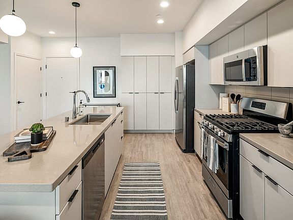 - Exterior features: 8-seat screening room, 9' ceilings, Additional resident storage available, Coworking space, Designer kitchen backsplash, EV charging stations, Electrical outlets with USB charging ports, GE stainless steel appliances, Medicine cabinet, On-Site Maintenance, Oversized kitchen island*, Oversized, triple pane bedroom windows, Package Receiving, Pet Park, Quartz countertops, Smart thermostats, TV Lounge, Tiled walk-in shower or large soaking tub, Undercabinet kitchen lighting, Vanity with quartz countertops, Water-efficient, low flow plumbing fixtures, Yoga and group fitness studio