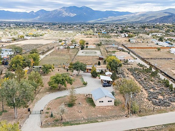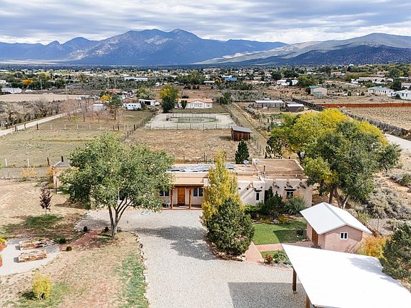 REMARKABLE PROPERTY featuring a 2100 sq ft. adobe home with 2 inviting portals and a 700 sq. ft. studio, big Taos Mountain views and a totally rural feel. The 1.44 acre lot has a park-like feel with gardens, small horse stable, large gardening shed, large carport, drip irrigation and irrigation ditch or what is know as an "acequia" for fruit trees and grasses growing throughout. Interior boasts "diamond finish"plaster, kiva fireplaces, granite counter tops, vigas, radiant floor heat, all beautifully maintained. A private well, El Valle sewer, natural gas, solar panels keep utilities low. Immaculately maintained, with many recent remodeling projects including baths, plastering and landscaping. The property is totally fenced with a remote control access gate for your security and peace. They say that a picture is worth a thousand words, with that in mind, be sure to click on the "Virtual Tour" for pictures, a virtual walk around the grounds and an ariel drone look from above. A truly beautiful place to live. Please come look.