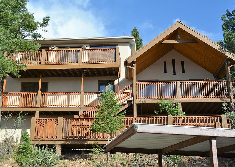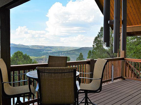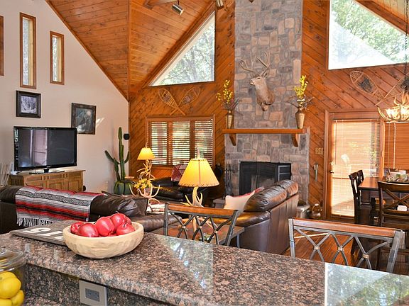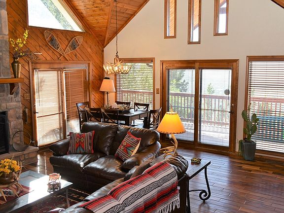 Here's the MILLION DOLLAR PANORAMIC VIEW everyone dreams of! Super updated 3 bedroom, 2 bath cabin offered furnished. Updates include a complete kitchen redesign with upscale finishes and appliances - including a wine fridge, new hardwood & carpet throughout, living area has cathedral ceiling and owners added rock to the soaring fireplace, renovated entry level full bath, refurbished wood ceilings throughout, restored outside decking & stairs and stuccoed exterior, Two bedrooms on entry level & large master suite on second level - with fireplace and private deck. Wrap around entry deck - hot tub too! Fenced yard. Don't miss out on this classy & inviting mountain cabin!