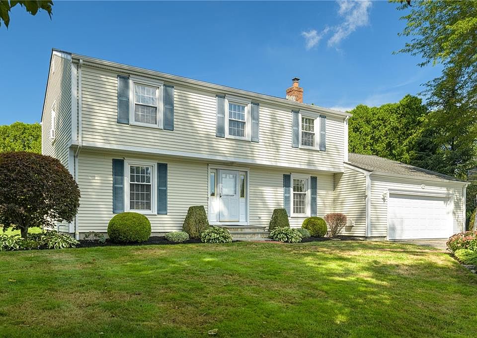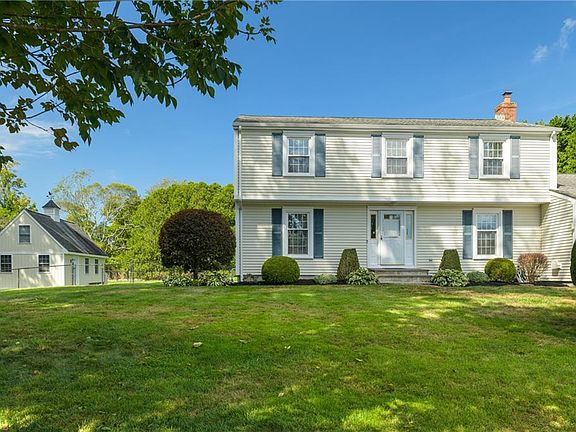 Tucked at the end of a cul-de-sac neighborhood on a beautiful corner lot, sits this four bed, two-and-a-half bath center colonial. The home provides a traditional floor plan with generous first floor living space for today's lifestyle. Step into the entry foyer appointed with hardwood flooring, with living room and dining room on each side. An eat-in kitchen, with plenty of cabinetry opens to a gracious family room with new carpet and wood-burning fireplace. On the second level, there are three guest bedrooms, all with hardwood flooring, a hall bath, and primary bedroom with en-suite bath. The sliding glass doors in family room lead you to a private patio and park-like, expansive, fenced-in backyard. With just under a three quarter acre parcel, the property is private and great for backyard entertaining. The 16 X 24 shed, with 8 foot ceilings, is perfect for a workshop or artist's studio. Tons of storage space in lower level and full attic is a bonus. Centrally located, you are minutes to Navy Base, local beaches, restaurants, shopping, and a short drive to historic downtown Newport and harbor.