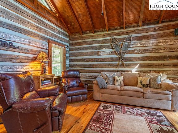 Back on Market! Escape the stresses of life at this furnished mountain cabin on a tranquil riverfront lot. Antique and modern elements come together in this unique property, great for a mountain getaway or vacation rental opportunity. The exterior features preserved circa 1882 logs, while interior showcases reclaimed trim from a 1940s tobacco barn, along with modern amenities like fiber optic internet. Relax in the welcoming living room with a gas fireplace, open to the kitchen and dining area. Enjoy the covered screen porch overlooking serene wooded property and open porch with a hot tub under the stars. A half-bath is on main level, while lower level offers two spacious bedrooms, full bath, and laundry. The lower level patio includes enclosed outdoor shower for convenience after a day on the river. Speaking of the river, the property boasts 125 ft of river frontage, perfect for fishing, kayaking, or just enjoying a leisurely day on the water! There's even an outbuilding for storing river toys and a firepit for those quiet evenings with friends or family. Near famed Phipps Store, 6 miles to Lansing and 10 to West Jefferson. For security, cameras with audio capability are in use on the property.