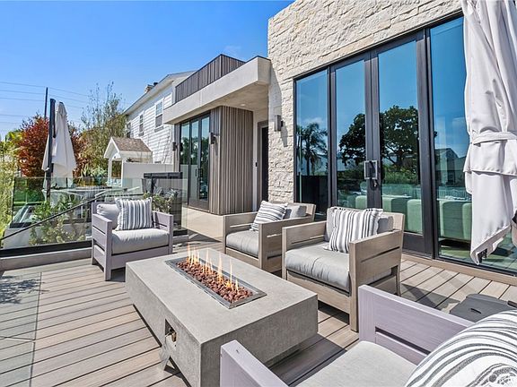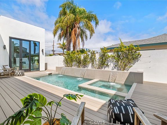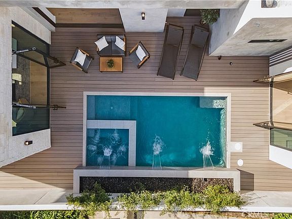 Constructed by Olive Avenue Homes in 2023, 215 Lincoln presents a State of The Art Single Story Residence with an inground pool and spa. This incredibly rare 5,497 square foot Downtown lot offers an unrivaled lifestyle and location, walking distance to the Beach, Downtown Huntington, Oceanfront Shopping Malls and 5 Star Resorts. Thoughtfully elevated 3 feet from street level, this home presents a grand stature on a deep nearly double lot footprint. 12 foot ceilings throughout all living areas creates a tremendous sense of space and volume. The outdoor entertaining areas including an on demand smart wifi pool and spa that operates from your tablet or smartphone, transitions seamlessly through towering 10 foot tall aluminum pocket and French doors into the living areas. Entertain in your modern European designed kitchen featuring chic matte finished porcelain countertops with bar top seating and top of the line appliances including a flush paneled built-in refrigerator, separate full height wine refrigerator and built-in microwave drawer & espresso/coffee maker. Custom millwork, floor to ceiling paneling and finished cabinetry were all hand built and stained by experienced inhouse woodworking craftsmen. Your living room and casual dining area are defined by wood French oak flooring, a beautiful fireplace, surround sound and elegant lighting features, all operational through smart home technology. The deluxe master suite with a warm fireplace offers a walk-in closet showcasing handcrafted cabinetry with integrated LED lighting and an awe-inspiring master bathroom with soaking tub and a massive walk-in shower cased in Italian porcelain tile. Two spacious additional guest bedrooms with individual full bathrooms share a private outdoor common area. Thoughtfully constructed, the finished garage has 13+ foot ceilings granting the owner an option for a car lift for supercars or collectible vehicles. Trex decking around the pool and the expansive front deck with built in firepit complete this incredible coastal property.