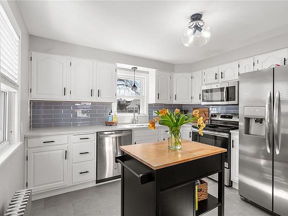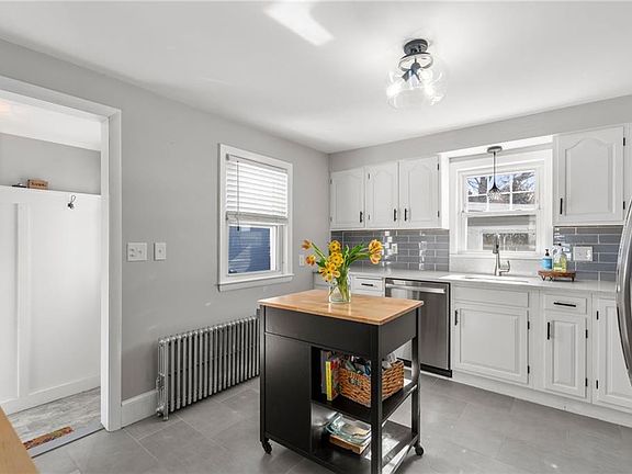 Impeccable 3–4-bedroom Cape, situated on side street in the heart of Darlington boasts a beautifully tiled breezeway featuring a wood panel coat rack accent wall! The eat in kitchen is bright & white, showcasing a modern farmhouse aesthetic with new quartz countertops & a built in breakfast bar. The open floor plan seamlessly integrates the living room, which features a shiplap wall with wood mantle & electric fireplace, perfect for chilly nights! Hardwood flooring flows effortlessly from the living area into the 2 bedrooms located down the hall. The full bath is complete with tile flooring and a new vanity. The 3rd bedroom & separate dressing room, which could serve as a 4th bedroom are located upstairs. The second floor has many built-in's(bookcase's/dressers) The home has gas heat & the interior & exterior have been freshly painted. The roof was stripped & resurfaced in 2015. Burnham furnace installed in 2012. Additional amenities include a garage, irrigation system & an expansive fenced-in backyard with a covered patio. Ideal for grilling or relaxation, as well as a firepit for roasting s'mores! The home is conveniently located just minutes from Daggett Field, Slater Park, highways, commuter train, schools, shopping & restaurants. Come see- A pleasure to show!