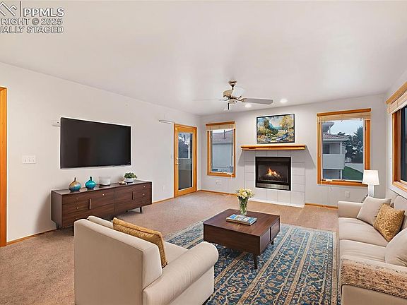 Great opportunity and priced to sell, this spacious end-unit ranch townhome offers both comfort and convenience in a quiet, well-cared-for community. The attentive HOA keeps the neighborhood clean and attractive, while the welcoming landscaping leads you into a home filled with natural light and an inviting open floor plan. The living room features a cozy fireplace, and the kitchen is equipped with a stainless 5-burner gas range, matching dishwasher, and a plethora of warm wood cabinetry, including a charming corner niche perfect for a coffee station. The large primary suite includes a spacious walk-in closet, private access to the deck, and a relaxing en-suite bath. A second main-level bedroom with French doors offers flexibility as a guest room or home office. The finished basement expands the living space with a large family room and two additional bedrooms, providing room for everyone. Recent updates include new tile floors in the main-level hallway and bathroom. Enjoy dining or relaxing outdoors on the private deck. Lots of storage in the unfinished basement section. Attached 2-car garage with direct access to the home adds convenience. Ideally located just minutes from I-25 and North Gate of the Air Force Academy. This home combines thoughtful design, modern comfort, and an excellent location. Virtually staged photos used in this listing. See Agent/Showing Remarks.