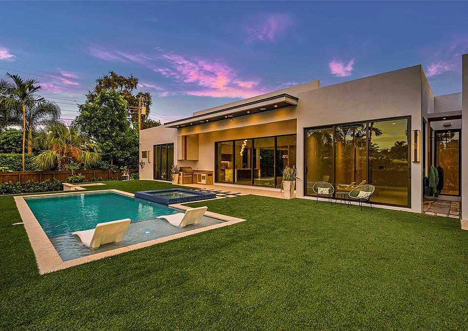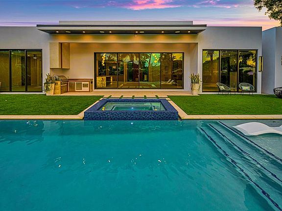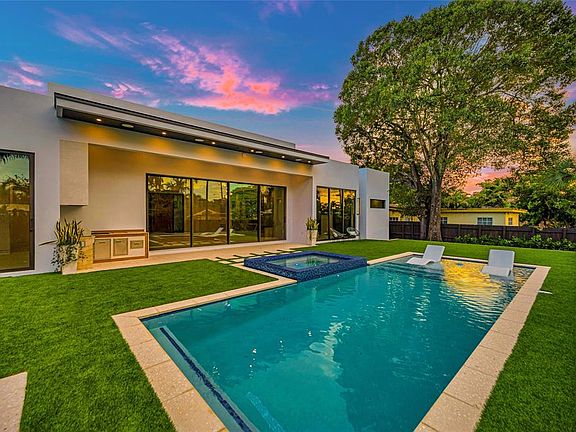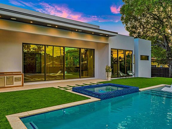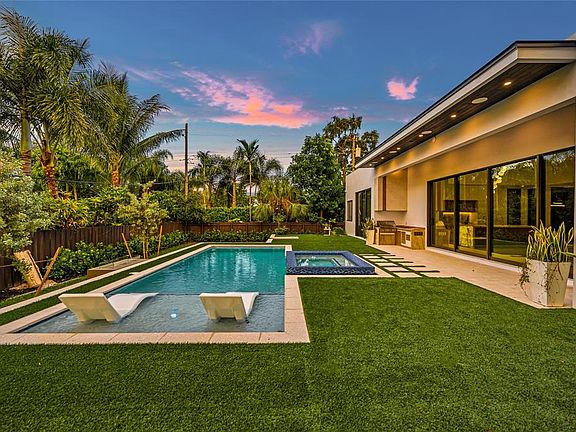 Experience ultimate modern luxury in this brand-new 2025 Wilton Manors estate w/ 4 bedrooms, 4.5 baths & 2,829 sqft. under air (3,188 total). A dramatic entry with floating steps over a cascading water feature leads to open, light-filled living spaces with soaring ceilings & walls of glass. The illuminated onyx kitchen island is a showpiece, paired with custom cabinetry & high-end appliances. Retreat outdoors to your private resort with heated saltwater pool, spa, sun shelf, outdoor shower, and full summer kitchen. Two separate driveways and a garage equipped with dual EV charging add convenience. Elevated construction exceeds city and county requirements, featuring impact glass, complete smart home automation, and advanced security. Prime location near beaches, Las Olas, and Wilton Drive.