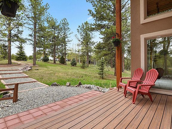 This spacious home nestled on two acres of forest was completely gutted & remodeled in 2016. A top remodeling company did all the baths, gourmet kitchen, lighting, interior doors & most of the flooring. It is like a brand-new home! Floor to ceiling windows w/lots of views of Pikes Peak! Welcome your guests w/circular driveway & the inviting covered front porch. Walk into the main level w/beautiful hand-picked Travertine with an array of gorgeous colors. Two-story great room has floor to ceiling windows, soaring ceilings covered in beetle-kill pine, moss rock gas fireplace w/a live edge mantle, & deck. Private office adjoins. The dining room is drop dead gorgeous w/German Rustic Beech wood from the Black Forest in Germany, china cabinets & bookcases, floor to ceiling windows, & beautiful solid hickory flooring that flows into the kitchen. The custom designed gourmet kitchen by Designer Kitchens upgraded w/ the same rustic Beech cabinets & Atlas slab leathered granite partially back-lit. The island has a wormy maple breakfast table that seats 4-5. Instant hot water, Viking warming drawer, Dacor microwave drawer, Thermador 5 burner gas cooktop, built-in refrigerator, steam oven. Walk out to the deck for BBQ's overlooking a the forest. The upper big level master spa like retreat offers floor to ceiling windows to let the nature in w/a serene view of aspens & pines w/no curtains needed. Soaking tub, custom door-less shower w/double shower heads, heated tile floor & tons of storage. 2 more large bedrooms w/ floor to ceiling windows & full bath completes the upper level. Lower level offers huge media room w/wood burning stove & walk out, flex room, nice sized bedroom, full bath & two bonus rooms. 7-person hot tub to enjoy private lot. Oversized 3-car garage dry-walled w/storage galore. Additional outbuilding for storage or art! So many upgrades as laundry shoot in master & kitchen, tankless hot water heater, humidifier, 50-year shingle. Enjoy mountain living at its finest!