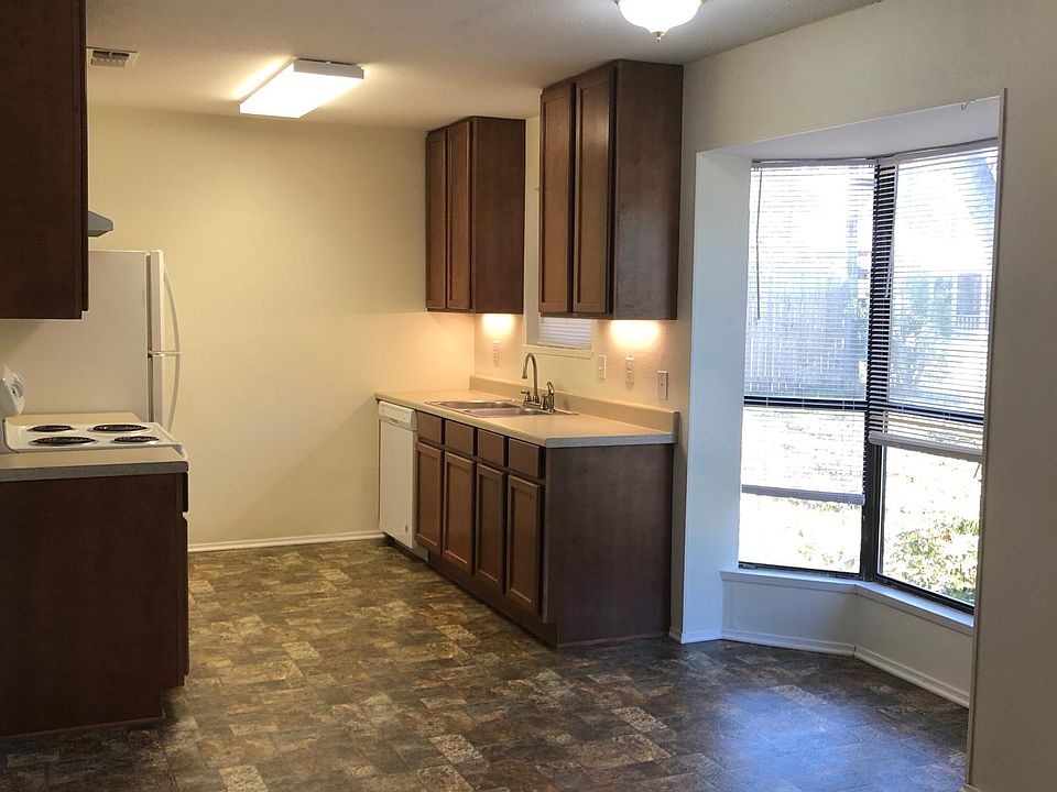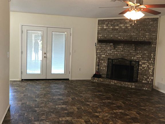 The interior looks warm with Pecan stained cabinets throughout the kitchen and bathrooms. Most of the fixtures and appliances have been replaced. Vinyl tile look flooring will compliment the grey brick fireplace and pecan cabinets. Plenty of lighting and fans add to the ambiance. A french door with in glass blinds,leads to the back yard that has plenty of shade. The trees have been pruned. The house has a one car garage with a electric garage door opener. The laundry is in the garage.