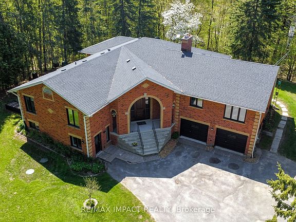 Discover the tranquility of country living in this beautiful brick raised bungalow, nestled privately away from the road on 25 acres, featuring 2 road frontages and bordered by the Oshawa Creek along the west boundary. There's a myriad of trails, ideal for exploring the natural surroundings of wildlife, white pine, Norway spruce, European larch, red oak, sugar maple and black walnut trees, currently under a Managed Forest Plan which reflects in lower taxes. This home features an over-sized double garage and charming 1-bedroom apartment with separate front entrance, perfect for multi-generational families or in-law suite. This ground level unit offers privacy and convenience, making it an ideal space for extended family members or guests (not retrofitted). As you enter through the custom 9' arched door elegantly framed by a matching arched side lite, there is a sunken foyer that leads to an open-concept kitchen/dining/great room accented with a Belgian White Ale pine ceiling and expansive triple pane/Low E windows, highlighting the extensive renos/updates completed in the last decade. Enhancing the culinary experience is an impressive kitchen with huge centre island, quartz counters, breakfast bar, s/s appliances, custom coffee bar and custom dining room cabinet, plus a butler's pantry with built-in wine fridge. Walkout to an inviting protected wrap-around deck or relax in the hot tub. The great room is equipped with an efficient hybrid catalytic wood insert, boasting modern technology and traditional design. The primary suite has a sitting area, walk-in closet and luxurious marble finished ensuite where you can unwind in a soaker tub set in a picturesque bay window or indulge in the spacious shower with rainhead. The main level also includes 2 good-sized secondary bedrooms, each featuring a walk-in closet. Throughout the home, there are beautiful oak doors/trim and some trendy flooring that includes hand-scraped bamboo hardwood, travertine and porcelain tiles.