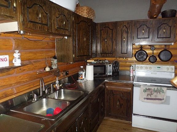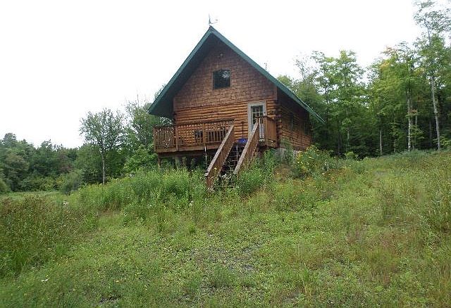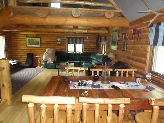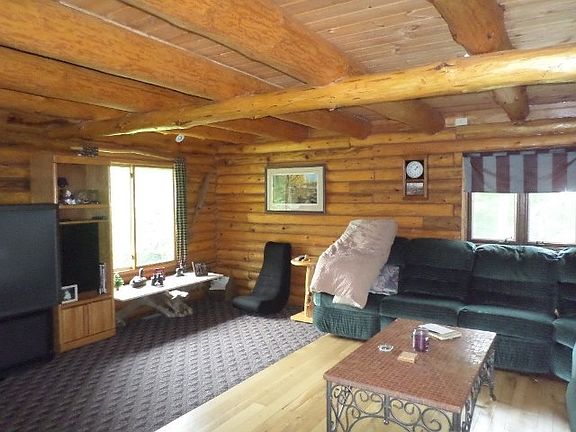 Incredible Family Vacation Get-a-Way...this secluded, year-round log cabin, built in 2004, has an open concept floor plan enhanced with log walls, wood floors, carved staircase, loads of light, large upper loft for sleeping and a walkout basement for sleeping and entertaining. Walk out the french doors on this lower level to a patio area with a view of Little Black River and a fire pit with a carved bench. This log cabin is set on 3+acres of privacy, surrounded by woods and is located just minutes from Sunday Lake, snowmobile trails and more. Call today for your appointment to see this exceptional property.