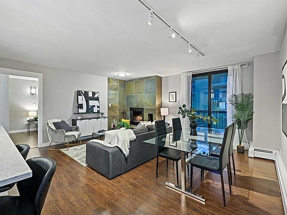 Corner unitOpen concept floorplanWrap around balconyBeautiful downtown viewsMurphy bedPrimary bedroomWood burning fireplace