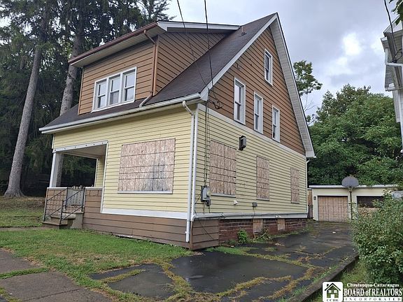 Take a look at this three story, four bedroom, 2 full bath home, with detached 2 car garage. Attached to the garage is a storage building with separate units. As you enter from the front of the home, you will walk into a large living area with a gas fireplace, a window seat and an enclosed porch with front bay window. The kitchen is a galley style kitchen with separate dining area and sliding glass doors that take you to the back covered patio and fenced yard space. On the second floor you will find a primary full bath with shower tub surround and three bedrooms. The front bedroom has its own separate full bath with shower stall and walk in closet. Plenty of space and storage. The attic has been finished with cathedral ceilings, walk in closet or office area. Ample under eave storage as well. With a little love and imagination this home could be an amazing home. Full basement with forced air furnace. Utilities will not be turned on. This home is being sold AS IS WHERE IS. Some of the copper and wires may have been removed and water has been disconnected. It is within walking distance to Downtown Olean, shops, dining, and entertainment, and all the amenities within the City of Olean and its neighboring towns.