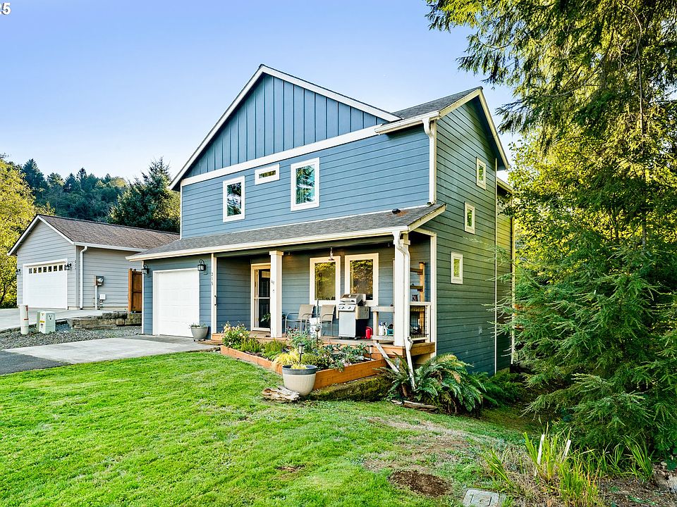 Treat yourself to a tour of the interior of this FABULOUS craftsman contemporary charmer. The 2008 built home updated inside & out, impeccably maintained- shows like a new built home. Open Concept Living; Front Room, Dining and Kitchen w/Vaulted Ceilngs and stunning LVT. Incredible Natural Light from numerous windows. Sliding glass doors open off cook's kitchen (Large island, pantry & lots of cabinets!) to the cedar deck - where lush green trees surround and privatize the back yard. Small fenced area perfect for children and/or dog area. Cozy propane fireplace, not currently used. Stair Lift. Primary bedroom with en suite, jacuzzi tub, private shower and toilet. Walk-in closet. Covered Front Porch. Laundry Room. Extra Storage; under home and attic. Attached Garage. Beautiful walking areas nearby, close to the center of town for dining, shopping and 7 miles of the Pacific Ocean and sandy beach!