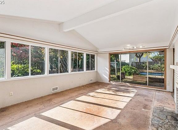 Large covered patioPartially finished basementLarge windowsGenerous kitchenVaulted ceilings with beamsCircular driveAdditional bedrooms