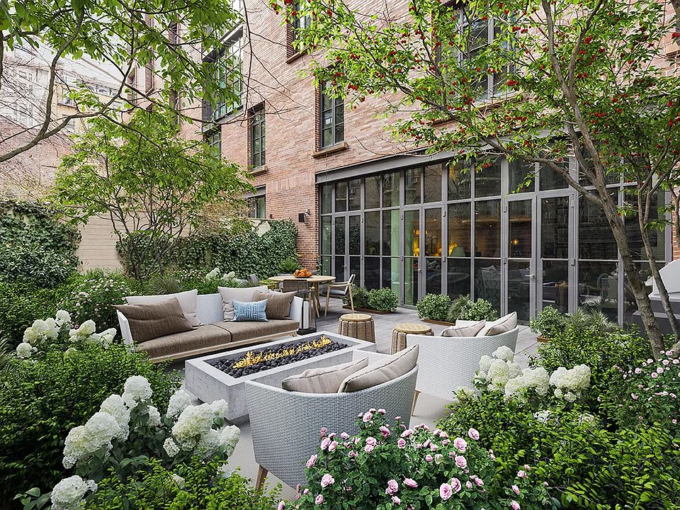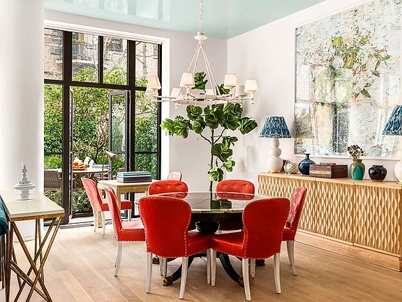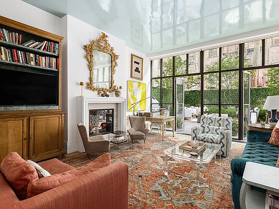 Greenwich Village Duplex Townhouse with a Private Car Garage and a 2,050sf Garden Designer stylings abound in this one-of-a-kind duplex townhouse nestled a block south from Washington Square Park, a sprawling 4-bedroom, 4.5-bathroom condo offering an exclusive Greenwich Village lifestyle with private parking and a tranquil garden sanctuary. Residents can pull into a single-car garage with storage, accessory rooms, and a private entry vestibule. An elevator and stairs lead up to the home's main level, beginning with an inviting foyer and gallery with a coat closet and powder room. The open-concept living room, dining room, and kitchen exude elegance and warmth. White oak hardwood floors complement chic light fixtures and designer wallpaper. A glass wall lets in natural light streams and opens out into a large garden adorned with mature trees, ivy-covered fencing, lush garden plots, and a built-in grilling station. The living and dining areas feature a fireplace and an alluring high gloss ceiling that mimics the surface of a reflective glacial lake. The kitchen is equipped with a huge eat-in island, marble slab countertops and backsplash, custom cabinets, and high-end integrated appliances, including double ovens, an espresso machine, and a full-size wine cooler. A guest suite with private closet space and a full bathroom completes the main level. Three additional bedroom suites and a laundry room occupy the home's upper level. The primary suite boasts couples' walk-in closets, an extra reach-in closet, a windowed en-suite bathroom with marble floors, a floating double vanity, a discreet water closet, a walk-in rain shower, and a freestanding soaking tub. The remaining bedrooms each have private closets and full en-suite marble bathrooms. The laundry room has a stacked washer/dryer, a utility sink, and ample storage. 215 Sullivan Street is an exciting boutique condominium imagined by Ed Rawlings, Eric Cohler, and Edmund Hollander. The building is surrounded by trendy restaurants, bars, cafes, and shops, and it is close to Washington Square Park, SoHo, and NoHo. Nearby subway lines include the A/C/E/B/D/F/M/R/W/6. Residents enjoy 24-hour door attendants, a state-of-the-art fitness center, a children's playroom, a bike room, private storage, and a stunning courtyard oasis. Pets are welcome.