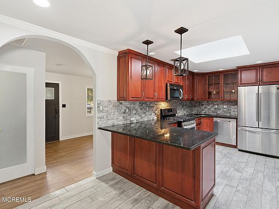 Modern kitchenBrick frontHickory cabinetryStainless steel appliancesGranite countertopsMarble backsplash