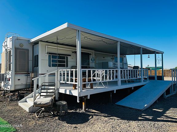 Desert Lovers Dream! Own your own piece of the desert complete with Tyson Wash ownership and gated private access in your front yard! Gather your friends and GET READY TO RIDE! The entertainment doesn't stop there! You're going to enjoy cozy living, lounging on a furnished deck with handicap ramp, full size refrigerator and dining table. BBQ area complete with a bar, and dining at the picnic table, watching the desert wildlife and campfire gatherings. Your desert home is move-in ready, features a queen bed with storage, double mirrored closet, built in dresser, walk-in shower, vanity, linen closet with all-in-one W/D. The kitchen features full size refrigerator and breakfast bar. Kick back and relax in your cozy living room complete with beautiful views an entertainment center and a desk. Your guests can camp out in the Winnebago with its own RV connection and meter. Fully fenced property also comes with 2 sheds, a storage shed, and a workshop shed that features a workbench, shelves and holds an additional BBQ and a portable A/C unit. There is an outdoor washer and yes, a bicycle too! (Small camper & utility trailer do not convey.)