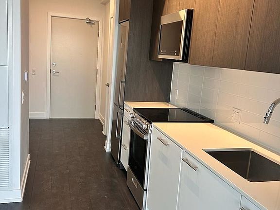 Walkout balcony unobstructed viewsFloor to ceiling windowsLaminate flooringModern kitchenStainless steel appliancesQuartz countertopEnsuite laundry