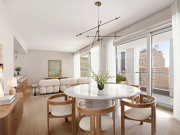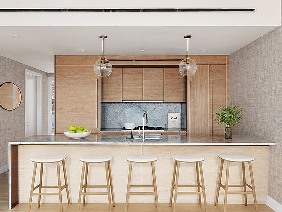 Upon entry, just beyond the initial walk-in closet, the sun-drenched living and dining areas unfold seamlessly onto the first private terrace, boasting over 48 feet of frontage along 28th Street. The exquisite chef’s kitchen is appointed with a fully integrated suite of Miele appliances, including a dishwasher and wine refrigerator. Custom white oak cabinetry by Scavolini envelops the space, accented with oil-rubbed bronze surrounds and under-cabinet lighting. A Dornbracht faucet in a platinum matte finish adds the final touch to this culinary haven.