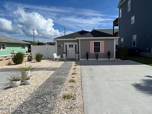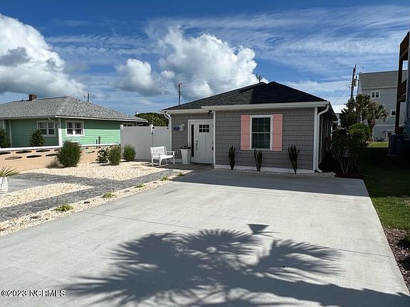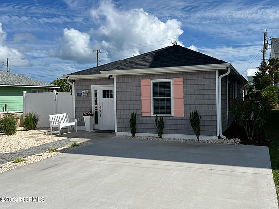 THE TRIPLE THREAT - LOCATION, PARKING, & NO HOA! This meticulously well kept beach bungalow is just perfection in Atlantic Beach! Not only is this 4th row, 2BR, 1 BA home NOT in a flood zone, it's also a short 2-3 min walk to the beach! From your back door, at the 3rd row of homes, walk towards the Raleigh beach access. Dream of living w/in walking distance to local restaurants, boutiques, wine & coffee shops & taverns? This location truly is special! Roof replaced in 2020. LVP flooring in 2021. Soft close kitchen cabinets, granite countertops, tile backsplash & appliances in 2021. Bathroom tiled & redone in 2021. New hot water heater in 2021. New lighting fixtures, paint & door knobs in 2021. New windows in 2020-2021. New compressor fan for air handler in 2022. Custom built closet in 2nd bedroom in 2022. Shutters installed & front/back doors painted to match in 2022. Owners' closet built into laundry room/mudroom in 2022 w/lock. Soft close cabinets & closet rods installed into laundry room/mudroom in 2023. Brand new front driveways & sidewalks (stamped concrete) paved in 2022 (can fit 3-4 vehicles dependent on size). Brand new back driveways (gravel) completed in 2022 (can fit 3 vehicles dependent on size (or a BOAT); this includes one vehicle parking parallel next to shed & not in the road). PARKING IS A PLUS ON THE BEACH! Pergola w/electrical outlet & fire pit installed in 2022. All landscaping configured & completed in 2022, including sod, shrubbery, plants, stones, etc. Outdoor plumbing for shower w/hot & cold water installed in 2022 & in use; buyer may want to have shower encapsulated w/wood or trexs. Shed w/electricity/lighting installed in 2022. Gorgeous original shiplap ceilings still intact, adding great character to this beach bungalow! Furnished including outdoor Polywood, décor, linens & kitchen furnishings (except for personal belongings; see exclusions list). Nest Thermostat & Cameras convey. NO HOA & NO FLOOD INS! Seller can close July 24 or later.