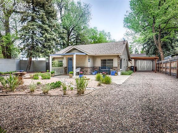 A centrally-located west side oasis! This lovingly maintained ranch-style home in Cheyenne Canyon is truly a gem, with a practical layout, glowing hardwood floors and natural light throughout. Enter through the front door to find an open concept living area, complete with an electric wall-mounted fireplace/heater and large picture windows. The office nook (also could be an eat-in area!) seamlessly transitions you into the kitchen, equipped with plenty of cabinet and counter space. Walk out from the kitchen onto the lovely covered patio, and admire the thoughtfully designed and fully fenced backyard, complete with a bonus, extra-large storage shed! Back inside, follow the floorplan flow towards the hallway, where two generously sized bedrooms and an updated full bathroom reside. An oversized carport and long rock driveway give plenty of parking options alongside the fully landscaped lot. Don't miss the irises just starting to peek their green leaves out of the flowerbeds! This property is walkable to the library, shopping, dining, and a quick drive to incredible hiking trails, the Broadmoor, I-25, and Highway 24. This is a fantastic property- we can't wait for you to take a look!