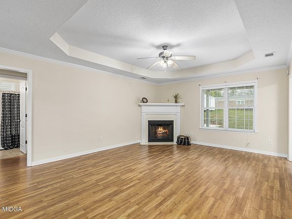 Inside, the cozy bedrooms are carpeted for warmth and comfort, while the inviting living room boasts elegant tray ceilings and a gas fireplace, creating a perfect space for relaxation. The eat-in kitchen offers a bright and functional dining area, ideal for casual meals.
