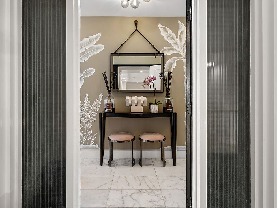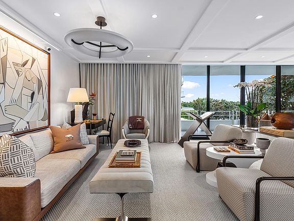 Experience the ultimate in elegance and tranquility with this newly renovated corner residence, perfectly positioned on an exclusive and secure island in Palm Beach. Just steps from the pristine beach and town tennis center, this contemporary home is designed for those who appreciate refined living in a premier location. From the moment you enter, you'll be welcomed by an atmosphere of sophistication and serenity. The expansive open floor plan boasts soaring 9-foot ceilings, stunning Dolomite Bianco Italian marble, exquisite Venetian plaster walls, and state-of-the-art Lutron lighting--every detail meticulously curated for a luxurious lifestyle. Floor-to-ceiling impact glass doors bathe the interiors in natural light and open onto a sprawling wraparound balcony, where breathtaking Intracoastal views and lush tropical landscaping create an idyllic setting for outdoor living and entertaining.