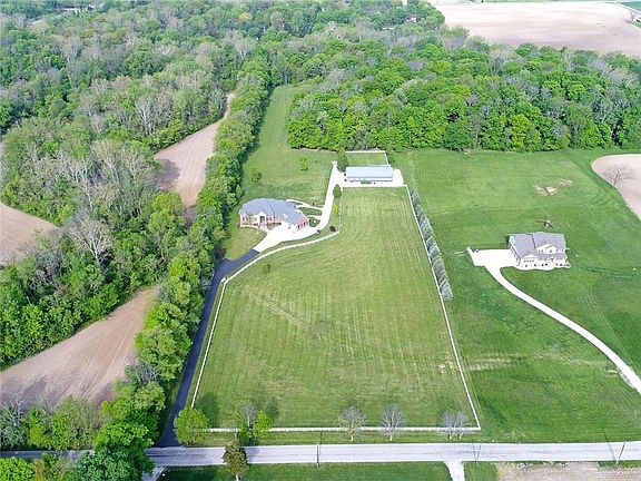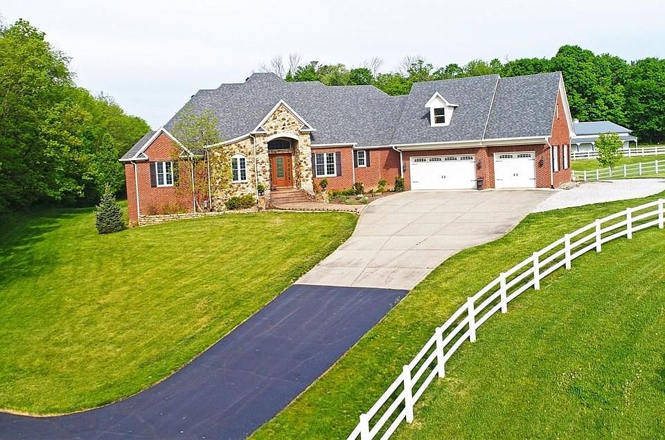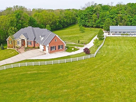 Fantastic property, home and horse barn w/fenced pasture resting on 10 rolling tree lined acres! Watch the sunsets, horses and deer from your large screen porch overlooking the grounds to the rear. This custom 4 BR, 4.5 ba home features a very livable, open floor plan with so many amenities carefully thought out. Master and addtl br on main, den w/blt ins, kitch/hearth rm open to GR, huge w/o base w/2 add'l BR's, rear base gar w/workshop, stairs from base to gar, hot tub & fire pit just outside, dual zone HVAC, brand new roof, heated tile floors, all brick/stone ext, huge unfin bonus rm w/stairway ready to finish-perfect for a private office, studio or playroom. Barn has two stalls/tack rm. Walk/ride trails through woods in rear. Must see!